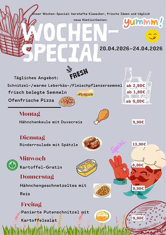 Egal ob es ein ausgiebiges Frühstück, eine deftige Mittagspause oder frische Backwaren sein sollen... Unser reichhaltiges Angebot an warmen und kalten Speisen, abgerundet durch unser umfangreiches Sortiment an Backwaren und Snacks, bietet die ideale Auswahl zum Verweilen oder Mitnehmen.